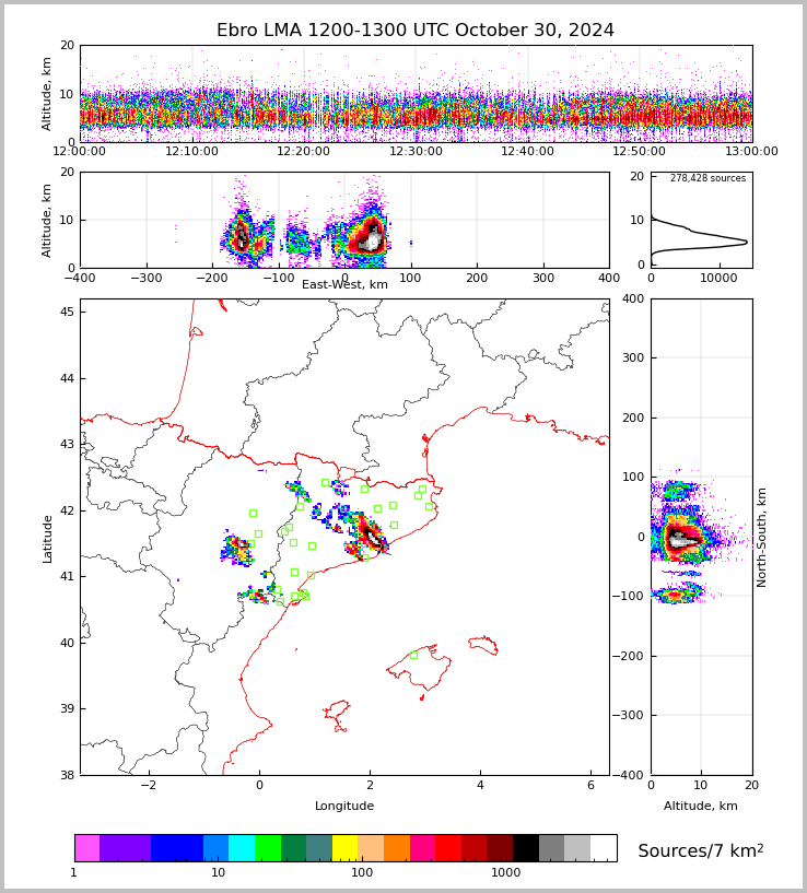Captura del mapa de l’ELMA que mostra el moment de màxima activitat elèctrica de la DANA a Catalunya el dia 30 d’Octubre de 2024, amb pics de 1000 emissions per Km2 a la zona del prelitoral barcelonès